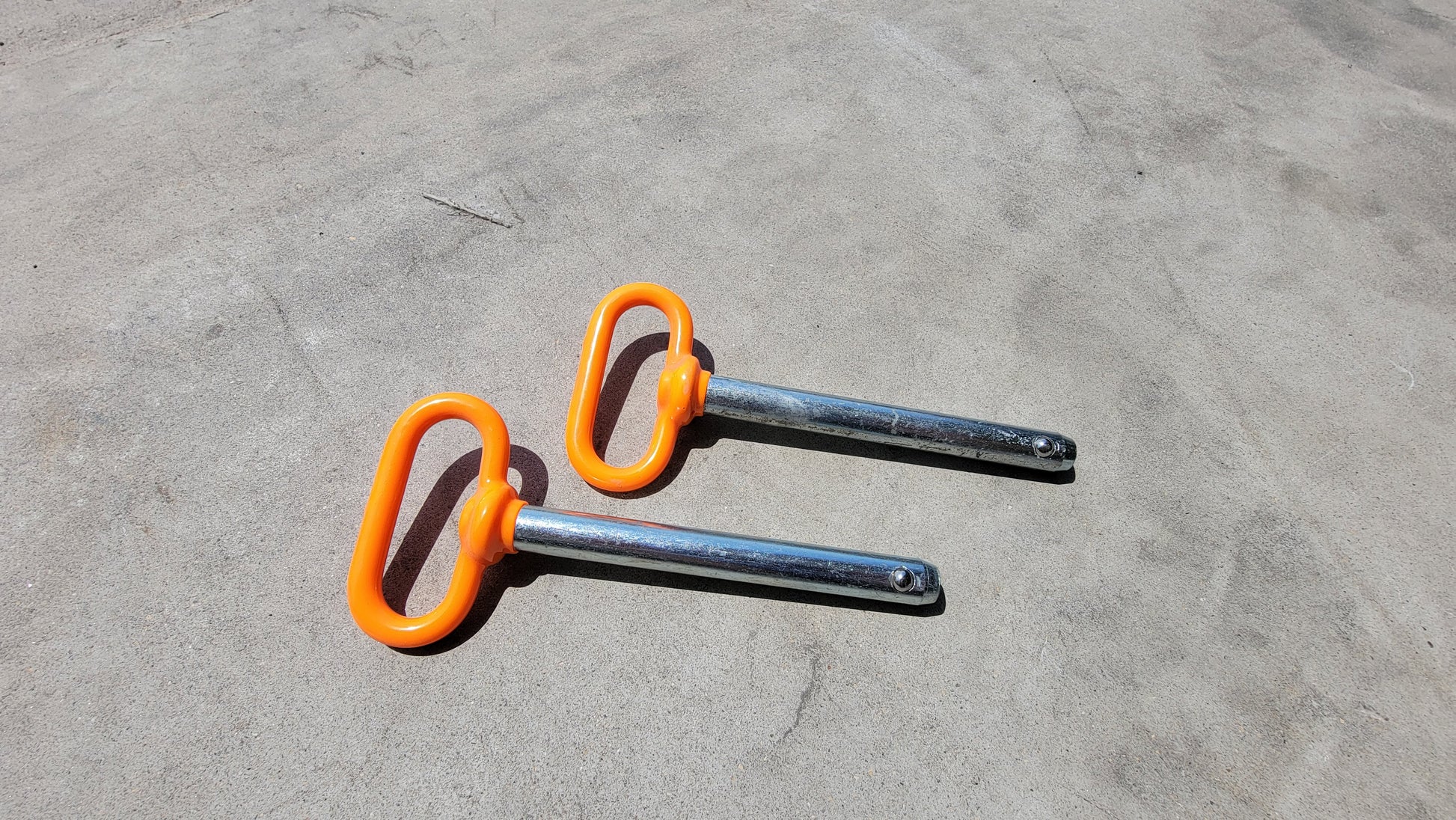 A pair of 4" orange handle detent pins to be paired with our Alpha Series Spotter arms